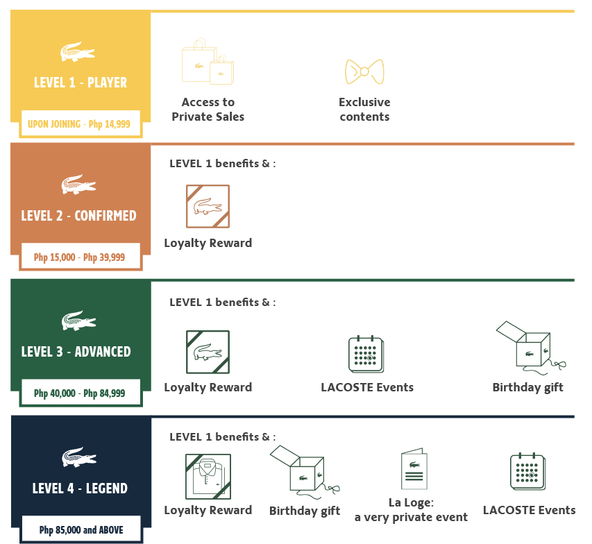 - a. Le Club Lacoste (Program) is a loyalty program offered to customers of Lacoste in the Philippines (Lacoste) and is operated by the Program Headquarters at Stores Specialists, Inc. (SSI). Members (Club Members) are given rewards, discounts, and privileges in accordance with the Program’s criteria for membership.